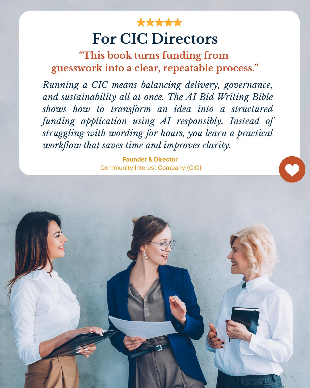 "Finally, a funding guide that meets you exactly where you are. Too many resources assume you're a professional bid writer with hours to spare. The AI Bid Writing Bible understands that for most CICs and community groups, funding applications are just one of a hundred things on your to-do list. This book is brilliantly structured, walking you from 'draft to funder' with crystal-clear instructions. The standout section is the practical breakdown of the Awards for All application, it's like watching a master at work, with the AI prompts laid bare so you can see exactly how to replicate the success. Whether you're a complete beginner or a seasoned fundraiser looking to halve your writing time, this guide is an absolute game-changer. Essential reading for the voluntary sector."
