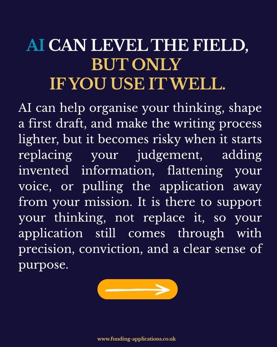 Across the sector, conversations about AI are increasing, but responsibility remains unchanged. Trustees and directors are accountable for every word submitted. The risk is not the tool itself. The risk lies in using it without disciplined oversight. Where project logic, governance checks, and evidence are already clear, AI can support drafting efficiency. Where those foundations are weak, it can amplify confusion. Organisations that approach AI as a drafting assistant rather than a strategist maintain control and compliance. The prompts in the living resources are designed to be used that way. You stay in charge. AI helps with the drafting.