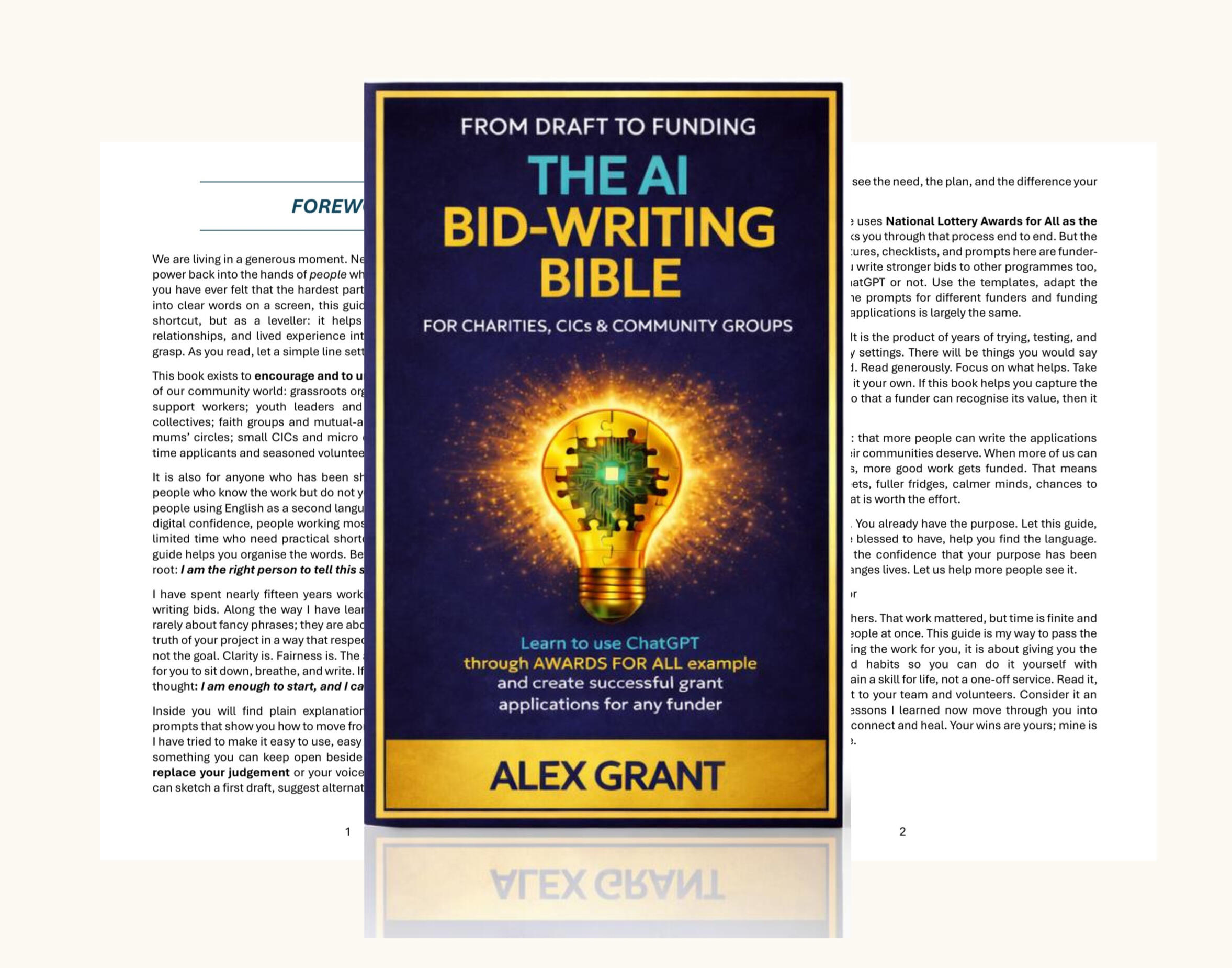 "This book doesn't just help you write bids; it makes you believe you can win them. As someone who always found the language of funding applications intimidating, The AI Bid Writing Bible was a revelation. It demystifies the entire process, breaking it down into simple, manageable steps that anyone can follow. The magic is in the practical 'learn by doing' approach, using the Awards for All template as your training ground means you build genuine skill and confidence before you even approach a larger funder. A.G. has given community groups everywhere a powerful, accessible tool to level the playing field. If you've got a project that needs funding, you absolutely need this book on your desk."
